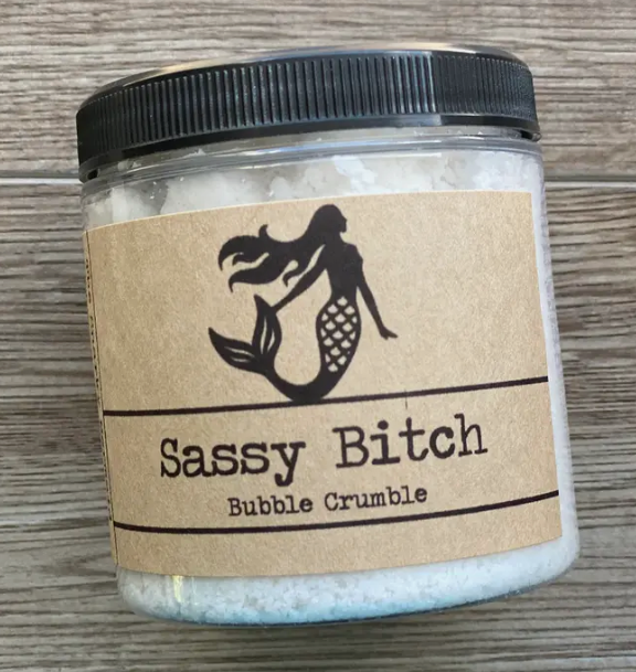 Sassy Bitch Bubble Crumble is an innovative way to enjoy bubbles in your bath taking your me time to an entirely new level. Sassy Bitch is available in Ginger Apple + Spice. Fresh cracked peppercorn blends with orange peel and mandarin for a spiced citrus treat. Tonka bean and vanilla in the base smooth out the zesty orange notes. Black pepper. clove leaf and orange essential oil enhance the juicy citrus and piquant spice. Size: 6 ounces