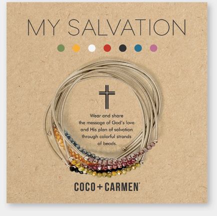 Wear and share God's love and salvation. Faceted glass beads and plated metal are uniquely crafted in the Salvation Silver Bracelet.