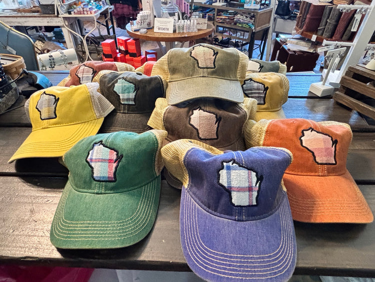 These adjustable caps are made exclusively for Lake Country Boutique by Country Weekend. They feature lightly distressed color washed caps that are adjustable to fit most adults and older children. Each hat is one of a kind and includes a variety of fall colors and coordinating flannel plaids. You can choose from two patterns: Minocqua or Wisconsin Map.