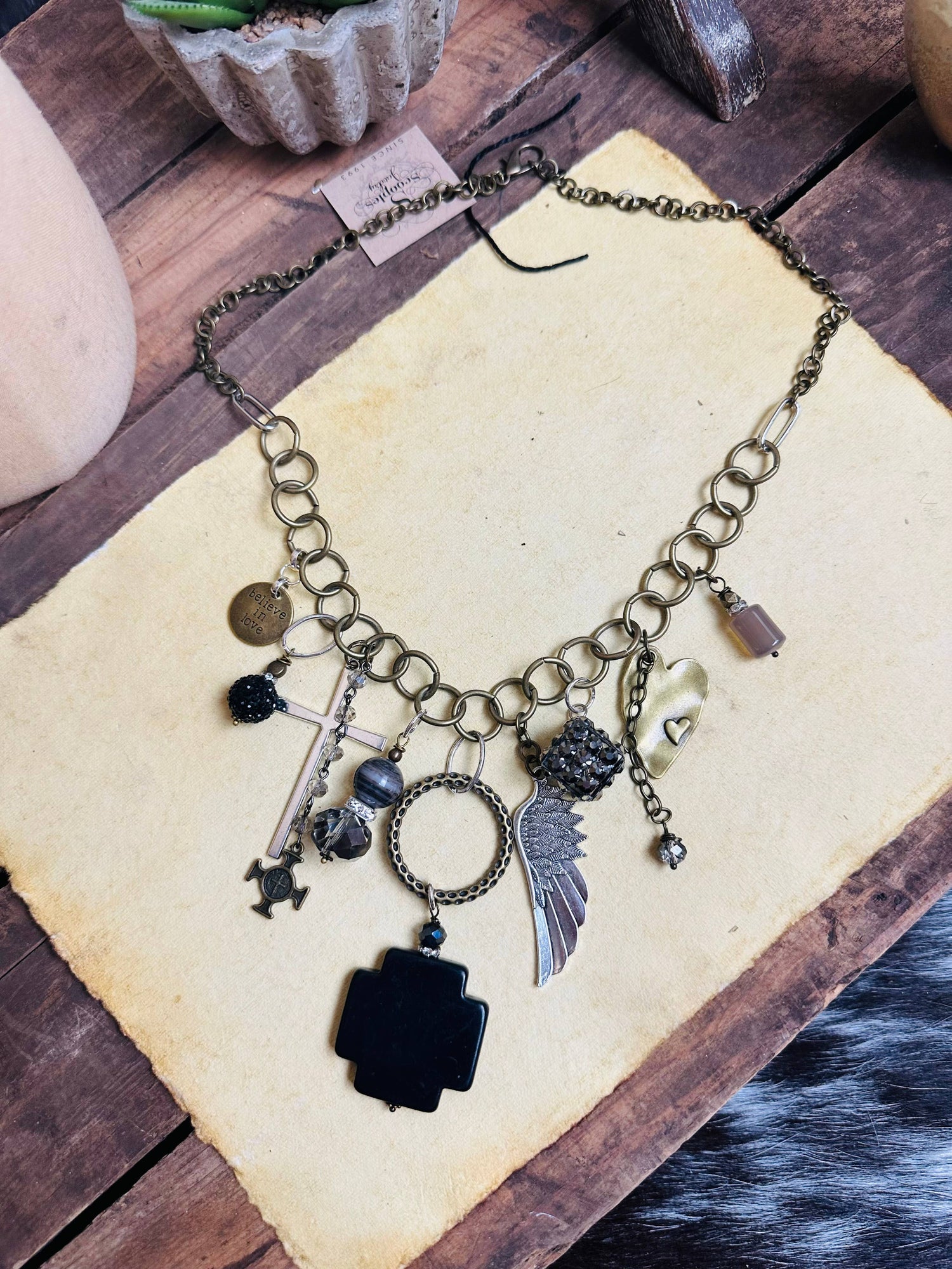 The Black Cross necklace from Scooples Jewelry is a unique blend of tradition and modernity. This 24" pendant/charm necklace is hand-crafted with the finest semi-precious gemstones, mixed metals, and various charms Each piece boasts a stunning color combination and personality and is made in the USA. This necklace is a testament to Scooples Jewelry's commitment to maintaining relevance to each buyer's culture and period, while staying ahead of the latest fashion trends.