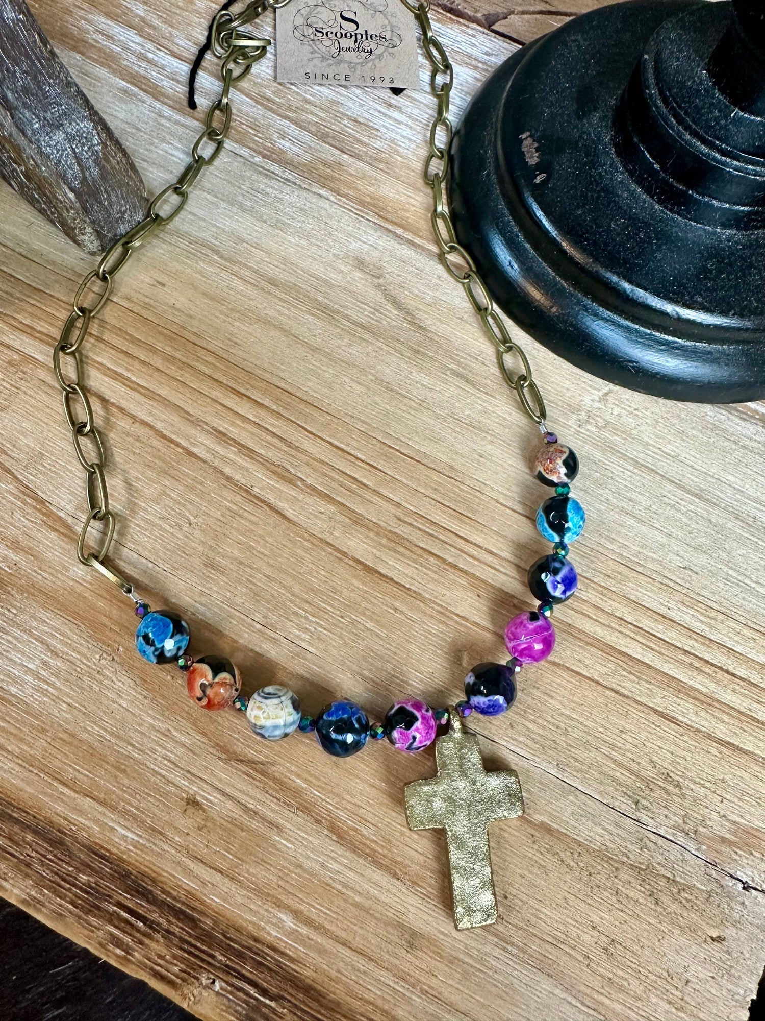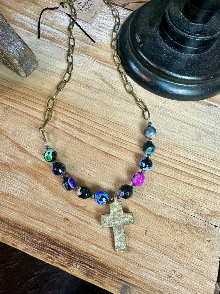 Showcase your style with Scooples Jewelry's Multi Agate Cross Neck 22” length , a pendant/charm with a cross necklace that stands as a testament to quality craftsmanship. Each piece is meticulously hand-crafted, featuring the finest semi-precious gemstones, an antique gold cross. With an eye for beautiful color combinations and the latest trends, this necklace is not just a piece of jewelry, it's a reflection of the period and culture of each wearer. Proudly made and shipped from the USA.
