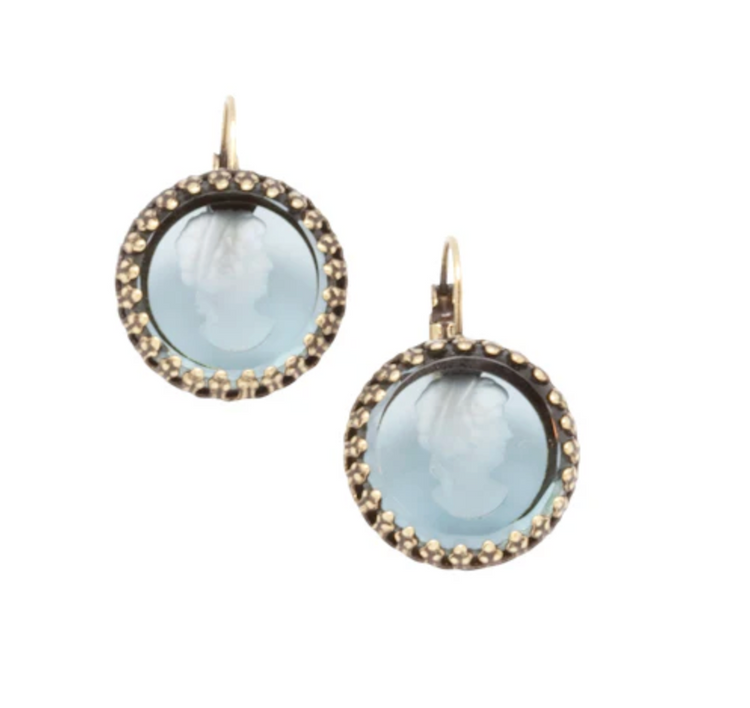 Nadine Delphine Jewelry Handmade in Paris Blue Glass Cameo Intaglio Earrings set in bronze metal