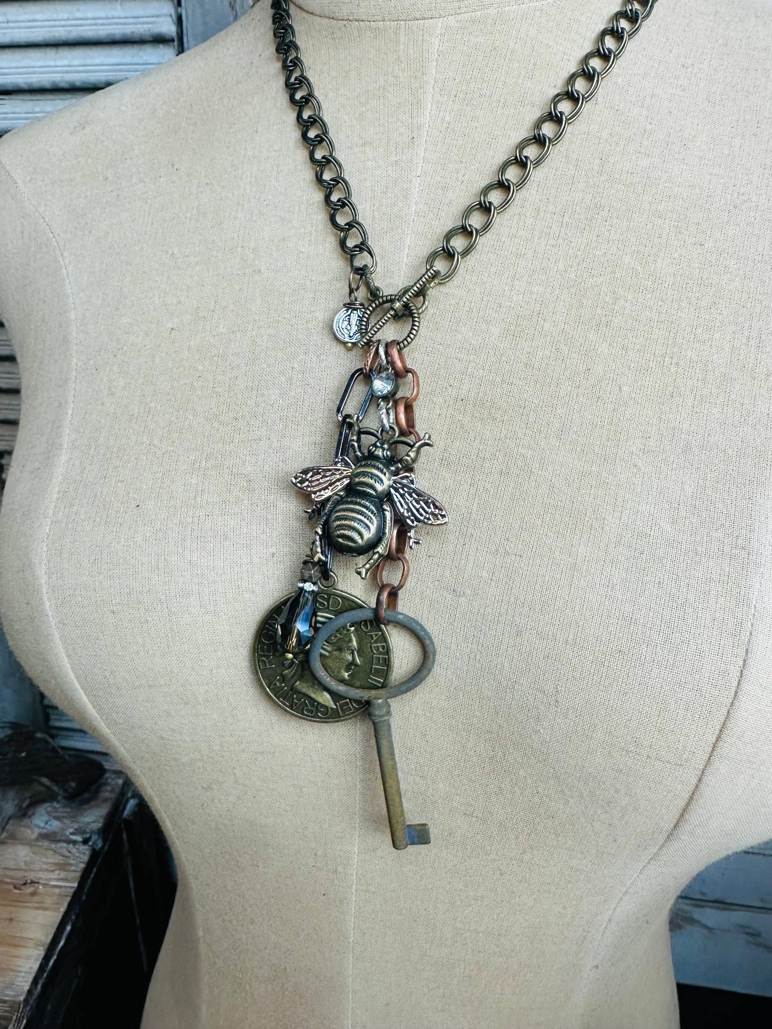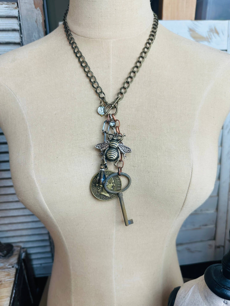 This necklace is mixed metals from antique bronze, copper and antique silver. It has a large bronze coin, antiqued patina key, crystal beaded charm, accent with a rhinestone charm, cross and large two tone bee. This has a lot to see and so much personality. It has a vintage look with so much character.
