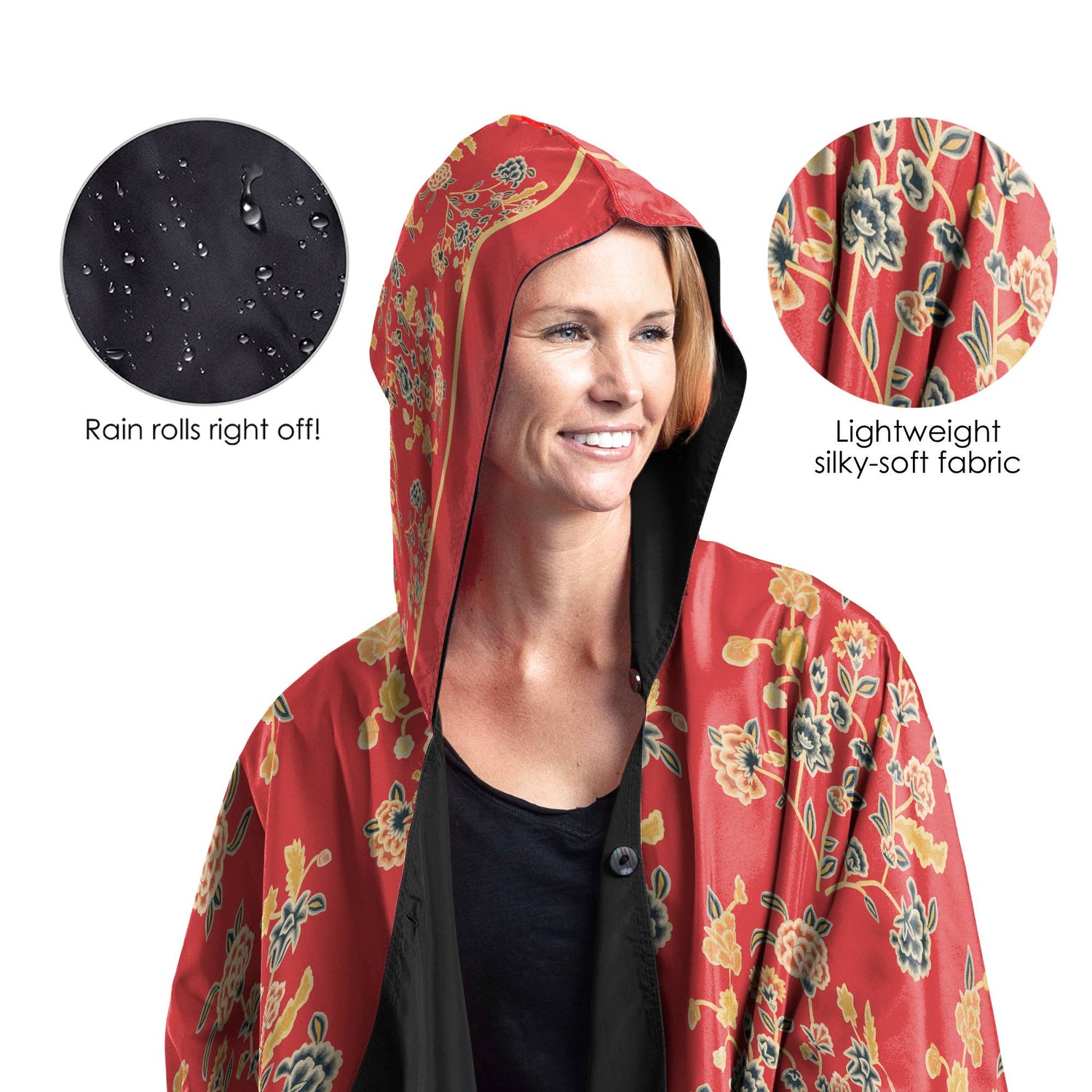 • Generous hood protects from wind and rain, yet is less bulky than a raincoat or jacket. Rain rolls right off!