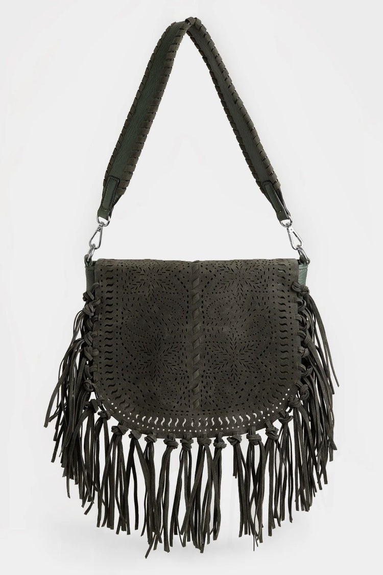 Boho bag with faux suede flap, laser cut designs and knotted tassels. Interior has built-in storage pockets. Two handles: braided shoulder strap and crossbody strap and back zip pocket.