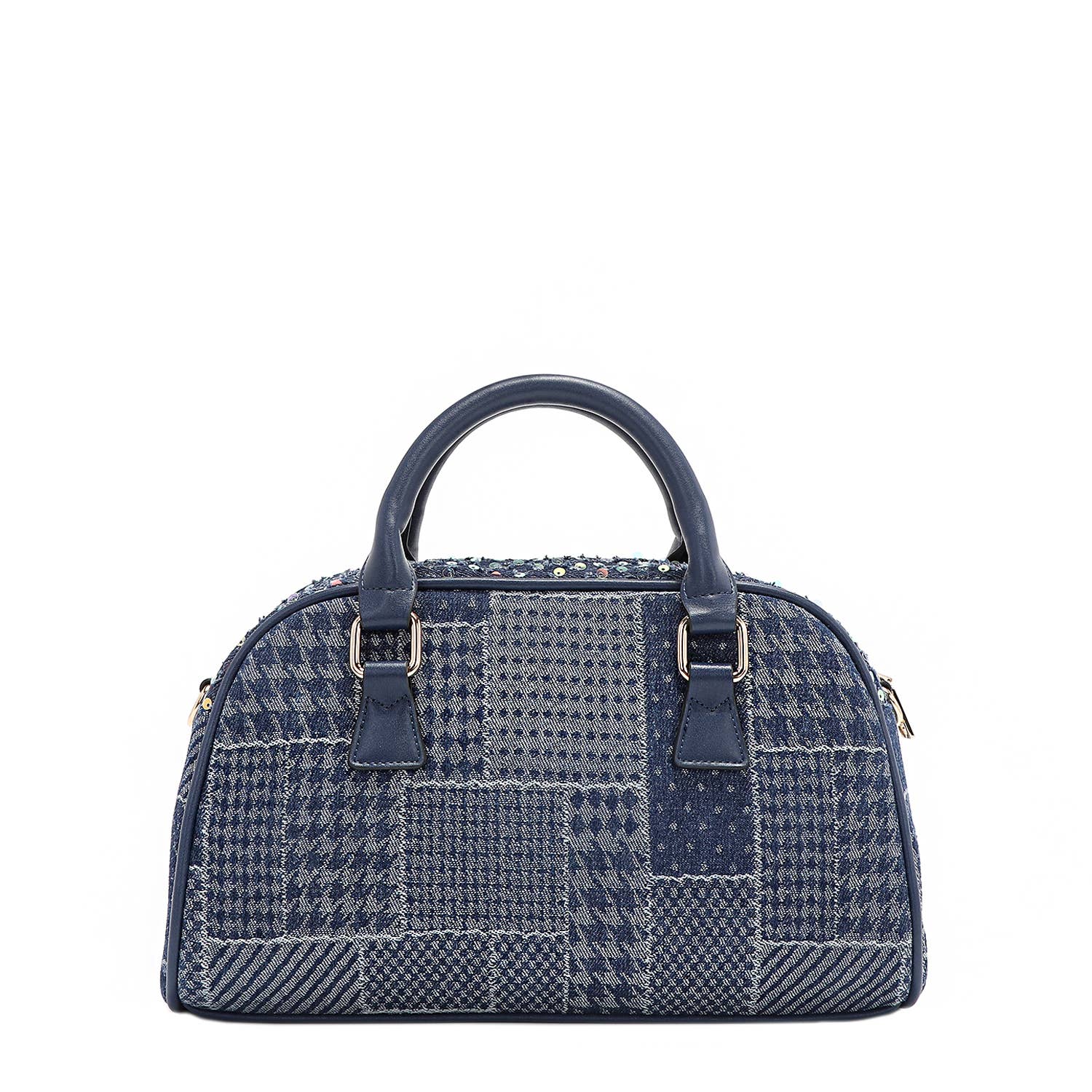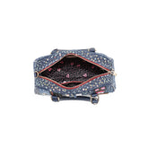 Our patch denim mini bowling bag is a stylish, trend-forward piece featuring a mix of patchwork denim, sparkling sequins, and intricate flower embroidery. Adorned with heart zipper pullers and a heart print lining, it’s love at first sight.