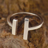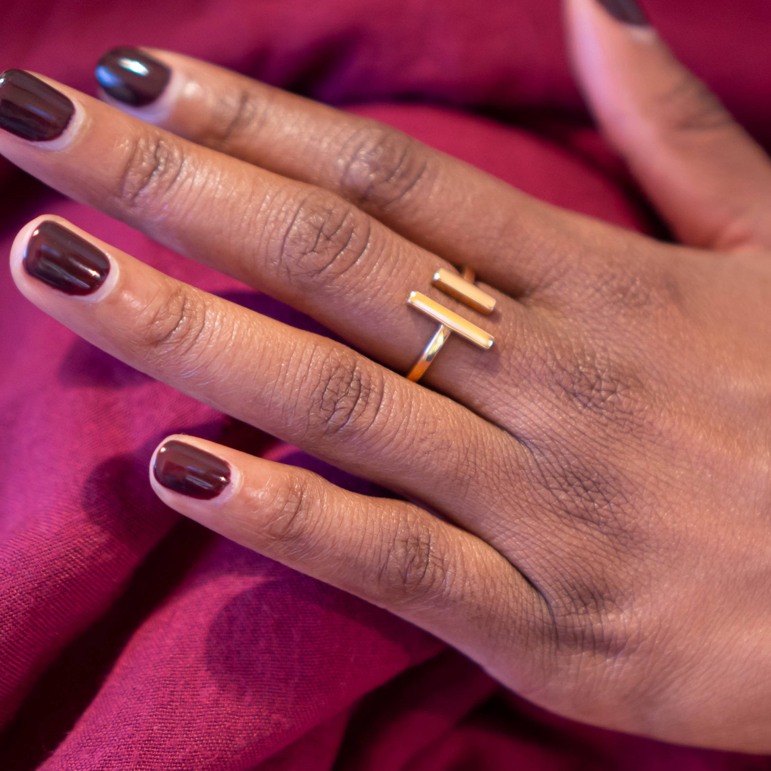 Adjustable Parallel Bar Ring. This modern and streamline design will make a beautiful addition to your ring collection. Lines play with one another to make a statement, and different angles form a unique shape. This ring is adjustable so that you can wear it on whatever finger you see fit.