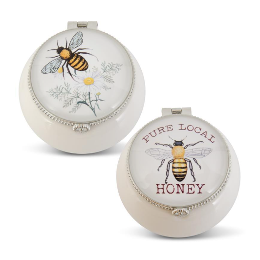 K & K Interiors White Porcelain Trinket Boxes w/Bee Decal Glass Lids (2 Style)