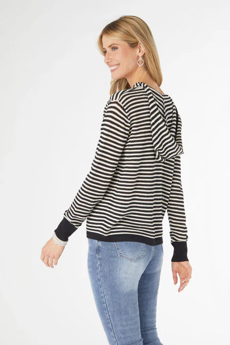 This Aruni V-Neck Striped Knit Top is the perfect combination of style and comfort. With its classic v-neck and long sleeve design, you'll stay cozy and chic all day long. The striped pattern adds a touch of fun, while the hood adds a trendy twist.