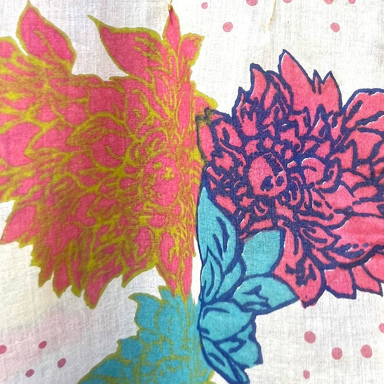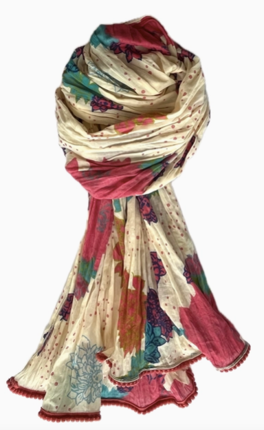 A vintage vibe flows across these florals. A Little Journeys Chicago Studio designed print. It works well with both brights and basics. Finished with cute bubble trim at the ends. Made in India.