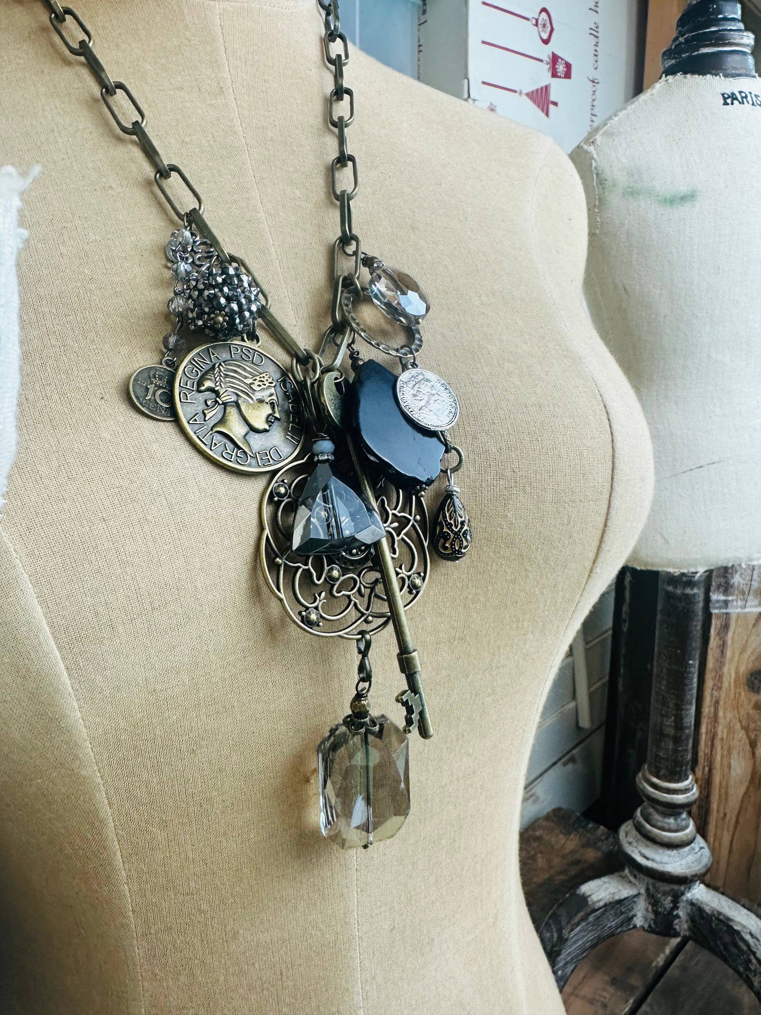 This group is in the grays, blacks, silver and antique bronze. Some of the many charms in this design include keys, coins, crystals and handmade beaded charms these are truly an artisan