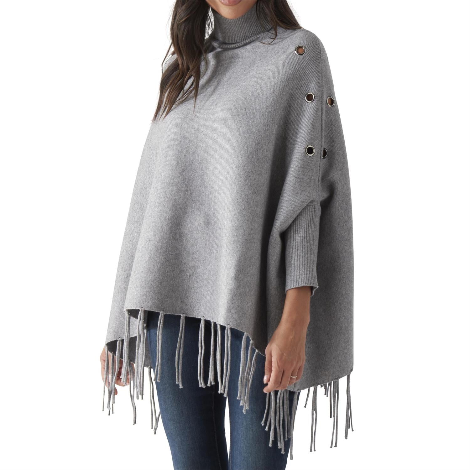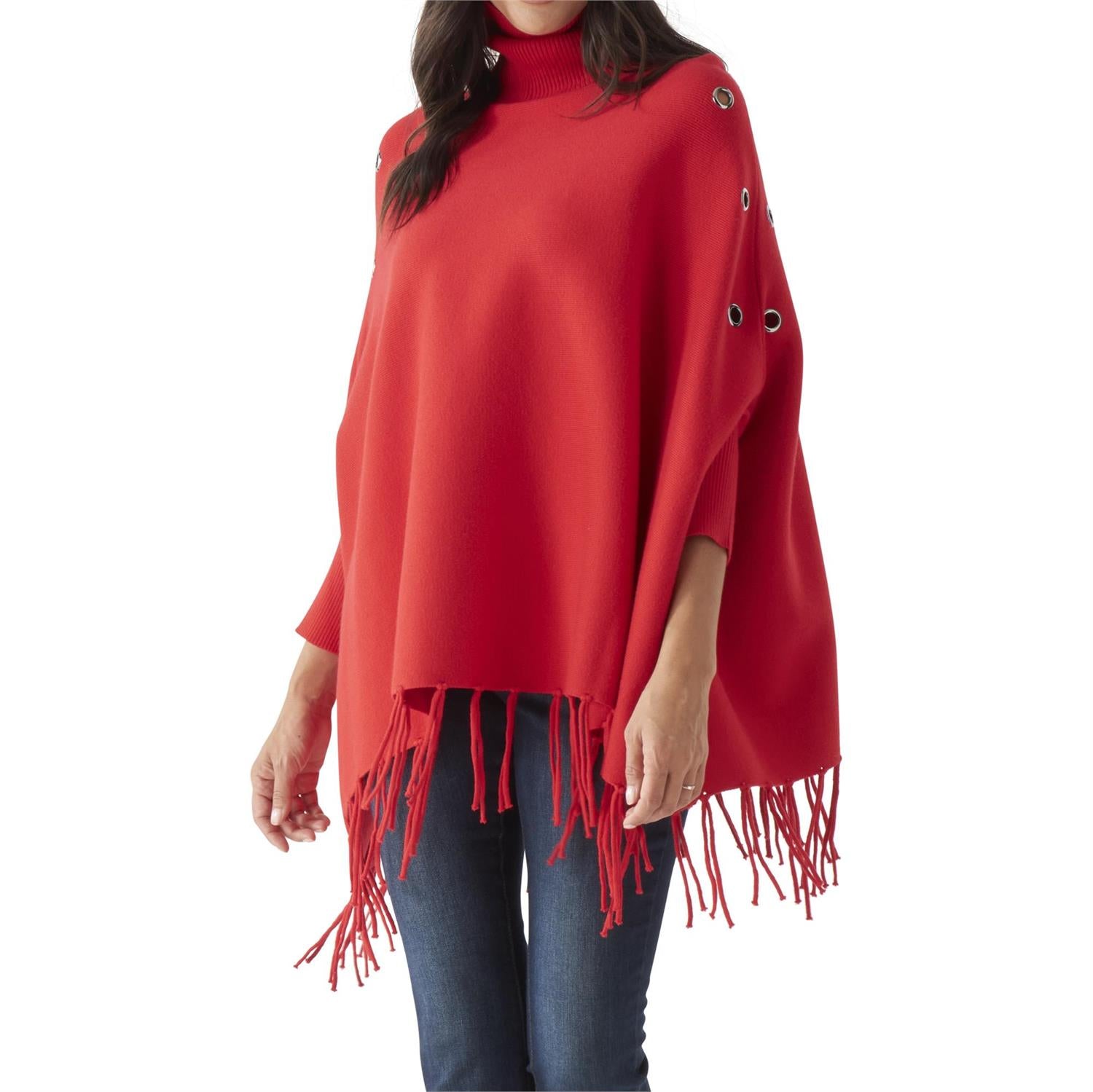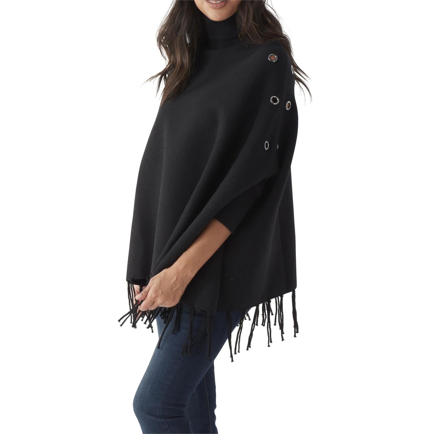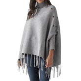 Elevate your cold-weather wardrobe with this eye-catching poncho! This piece combines the ease of a poncho with the structure of a sweater. The grommets and fringe add a little something extra.