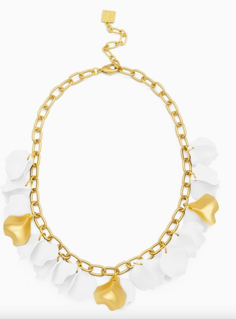 Matte gold chain collar necklace with hand-painted resin petals in a matte finish and accented with matte gold petal charms. This style is completed with a lobster claw closure.